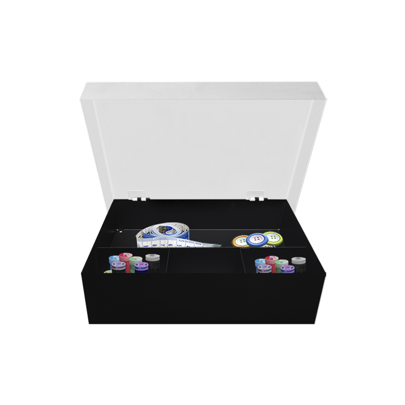Caixa organizadora para itens de costura como linhas, agulhas, tesoura e botões. Possui quatro subdivisões, sendo uma grande e três pequenas, para facilitar a distribuição.